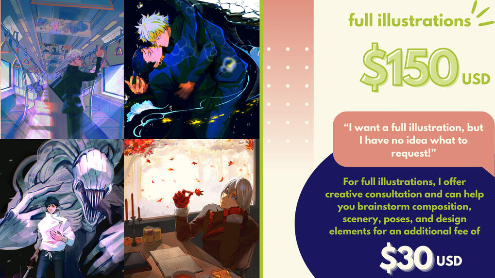 For full illustrations: Half (50%) of the payment is required upfront (receiving this payment will initiate my work on the commission) and the remaining balance must be paid in full at completion. You will have up to 10 days after commission completion to provide the remainder of the payment.